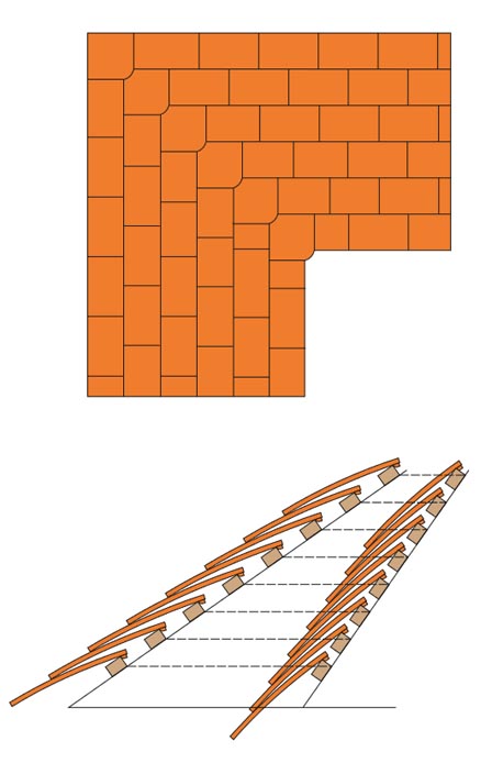 The ideal situation for this type of detail is, for example, a dormer, where the laced valley meets a ridge part way up a main roof slope. In this case, the upward curve of the tiling and ridge line can be absorbed in the main tiling courses above.